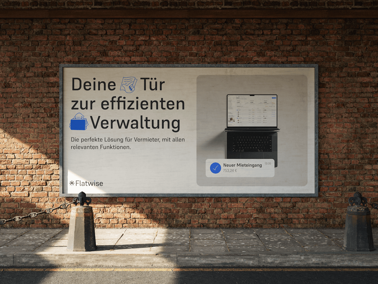 Die UX/UI der Webapp wurde konsequent auf Nutzerfreundlichkeit ausgelegt. Eine reduzierte Formsprache hilft Vermieter:innen, sich intuitiv zurechtzufinden – sei es bei der Objektverwaltung, der Kommunikation oder dem Finanztracking. Auch in der Kommunikation setzen wir auf Einfachheit und Klarheit. Plakate mit Claims wie „Deine Tür zur effizienten Verwaltung“ machen Flatwise greifbar – als smarte, alltagstaugliche Lösung für eine Zielgruppe, die sonst wenig digitale Angebote hat.