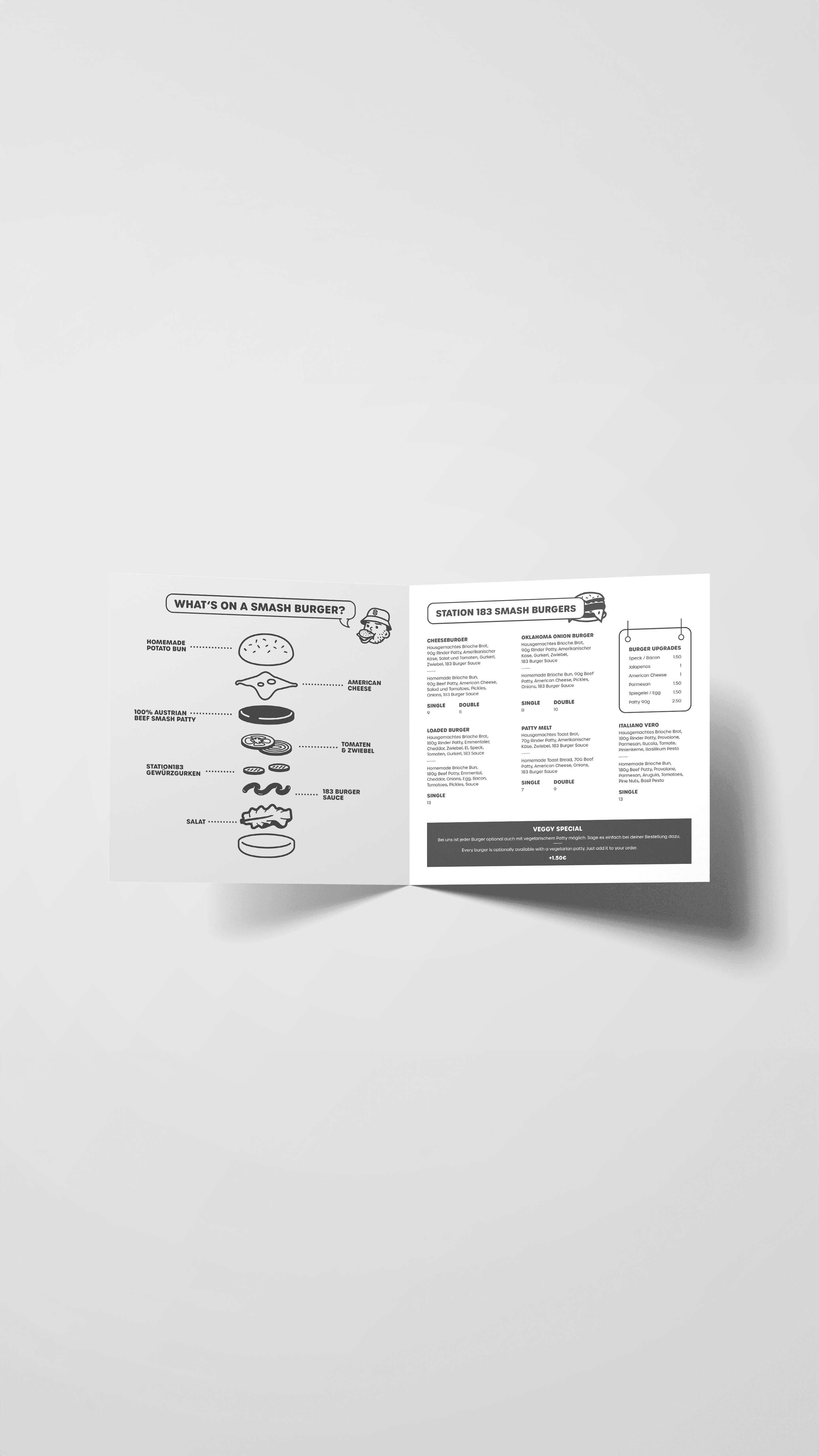 Der Markt für Burgerlokale boomt – aber Station183 sollte sich bewusst abheben: durch Haltung, Wiedererkennung und Detailverliebtheit. Das entwickelte visuelle System spielt mit einem urbanen, leicht ironischen Ton, ohne beliebig zu wirken. Das ikonische Gesicht im Fischerhut und Burger im Mund wurde zum sympathischen Key Visual und zieht sich als Figur durch alle Touchpoints.